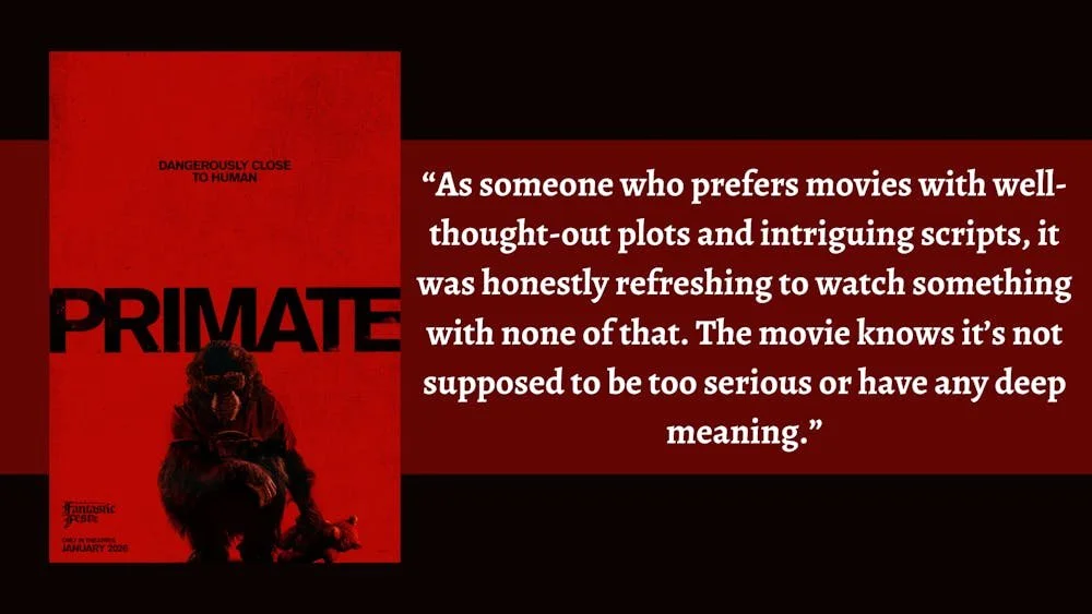 Over J-Term, I met up with the same friend to see a movie, but our options were limited. I’d already watched “Marty Supreme,” which has the potential to be the best movie I’ll see in 2026, and there weren’t many other choices that we found interesting. While we were scrolling through the Emagine website, we found a one-word title that neither of us had heard about at all: “Primate.”
